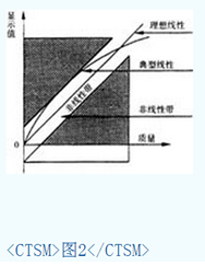 線性檢定是指加載試驗(yàn)時(shí),所加載荷與相應(yīng)示值之間的線性關(guān)系好壞的一種評(píng)估,常用天平示值與理想線性直線即從零載到*大秤量的連線之間的正或負(fù)*大偏差值表示,如圖2。