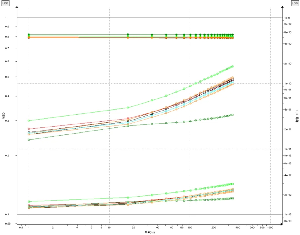 介質譜分析測試的是各個不同頻率下的電容值和介損值,并繪制成電容和介損的頻率曲線。介質譜曲線能夠更為清晰地反映絕緣的狀態,并且有助于判斷測試結果是否存在異常。介損隨頻率改變,從左到右頻率逐次增大。可以看到,測試結果曲線與模型曲線十分平滑且基本一致。模型曲線與測試曲線有偏移的原因是溫度不同。