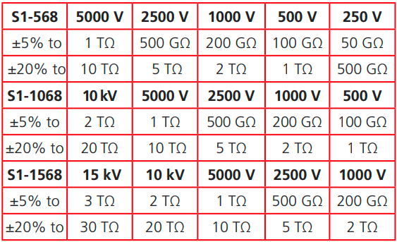 250V, 500V, 1000 V, 2500 V,5000 V, 10000 V, 15000 V, VL |